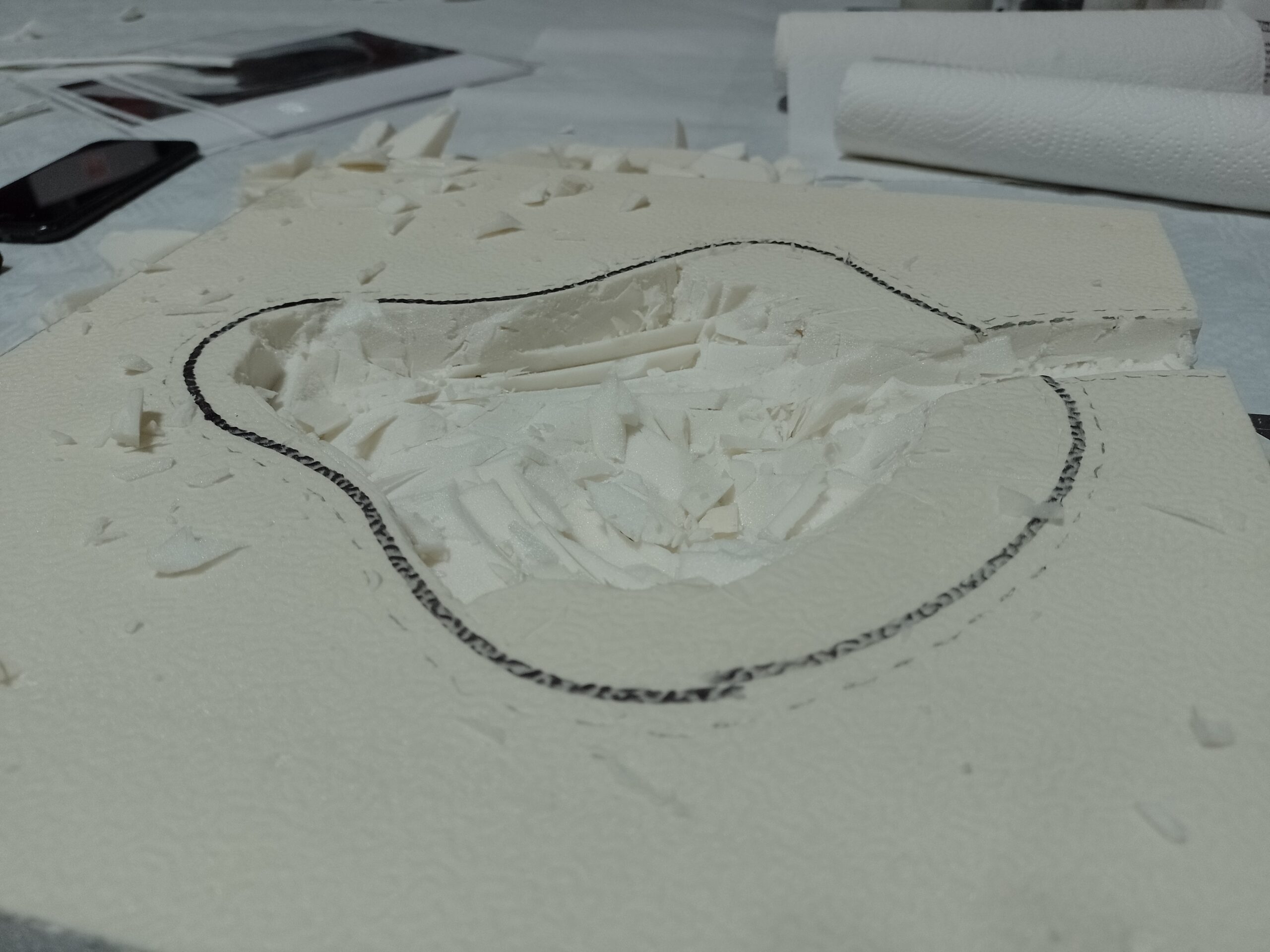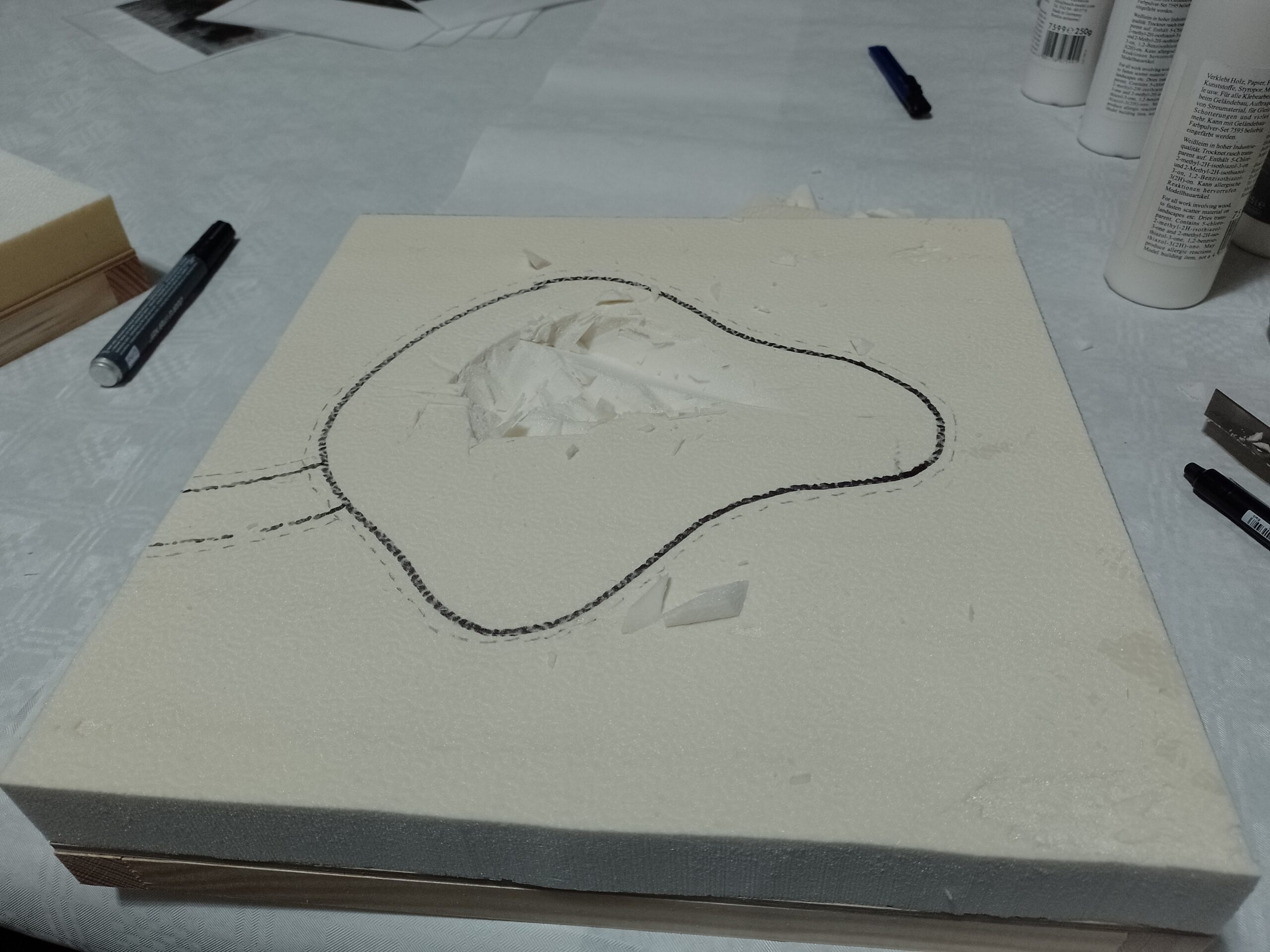 Auf der Styrodurplatte (3 cm dick) wird der Umriss des Stillgewässers festgelegt, inklusive eines Zulaufs