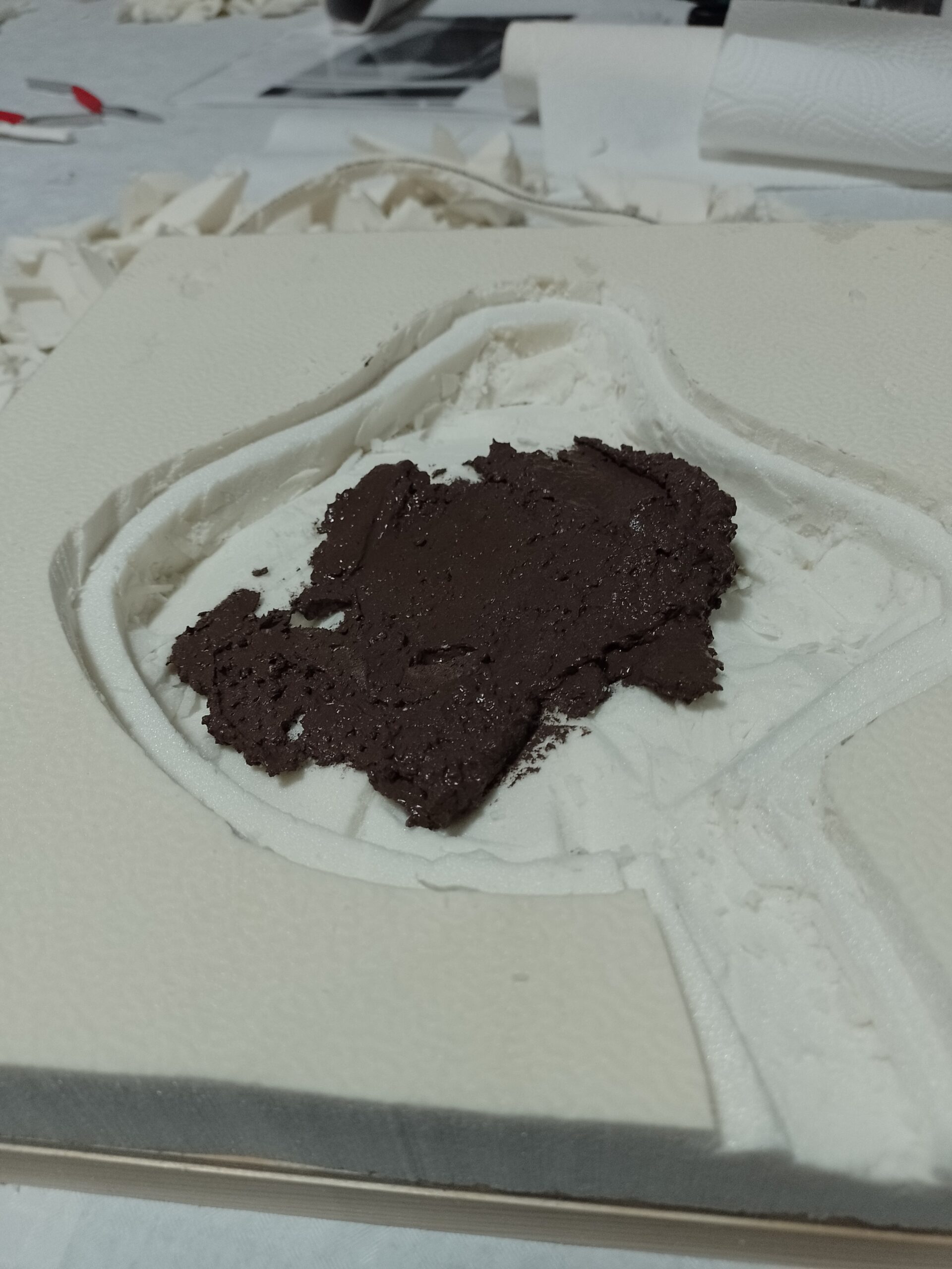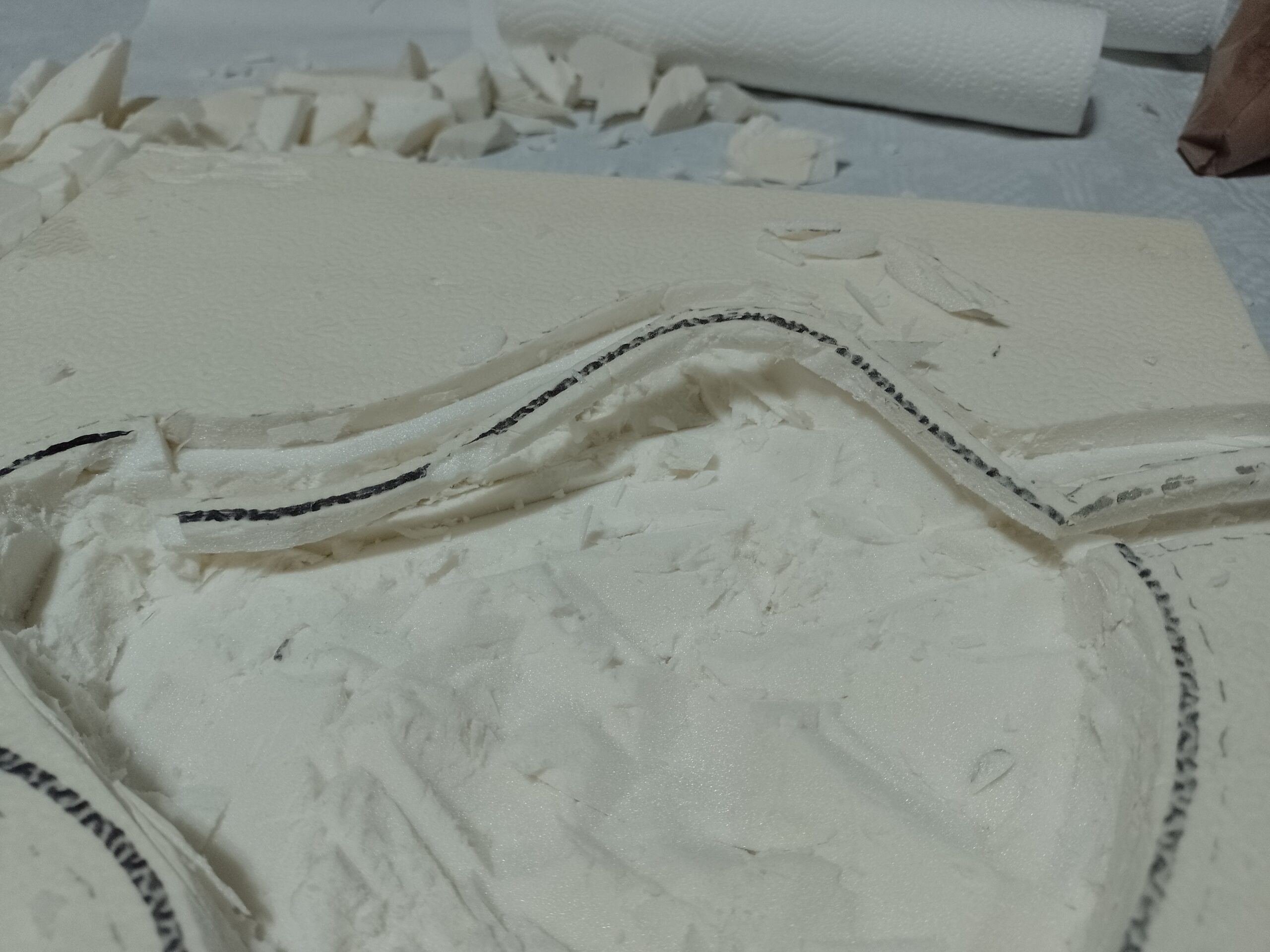 Mit einem Cuttermesser werden vorsichtig die Konturen des Gewässers ausgeschnitten. Möglichst große Stücke herauslösen. Die „Abfall“stücke aufheben, z.B. zum Bau einer kleinen Felsenformation
