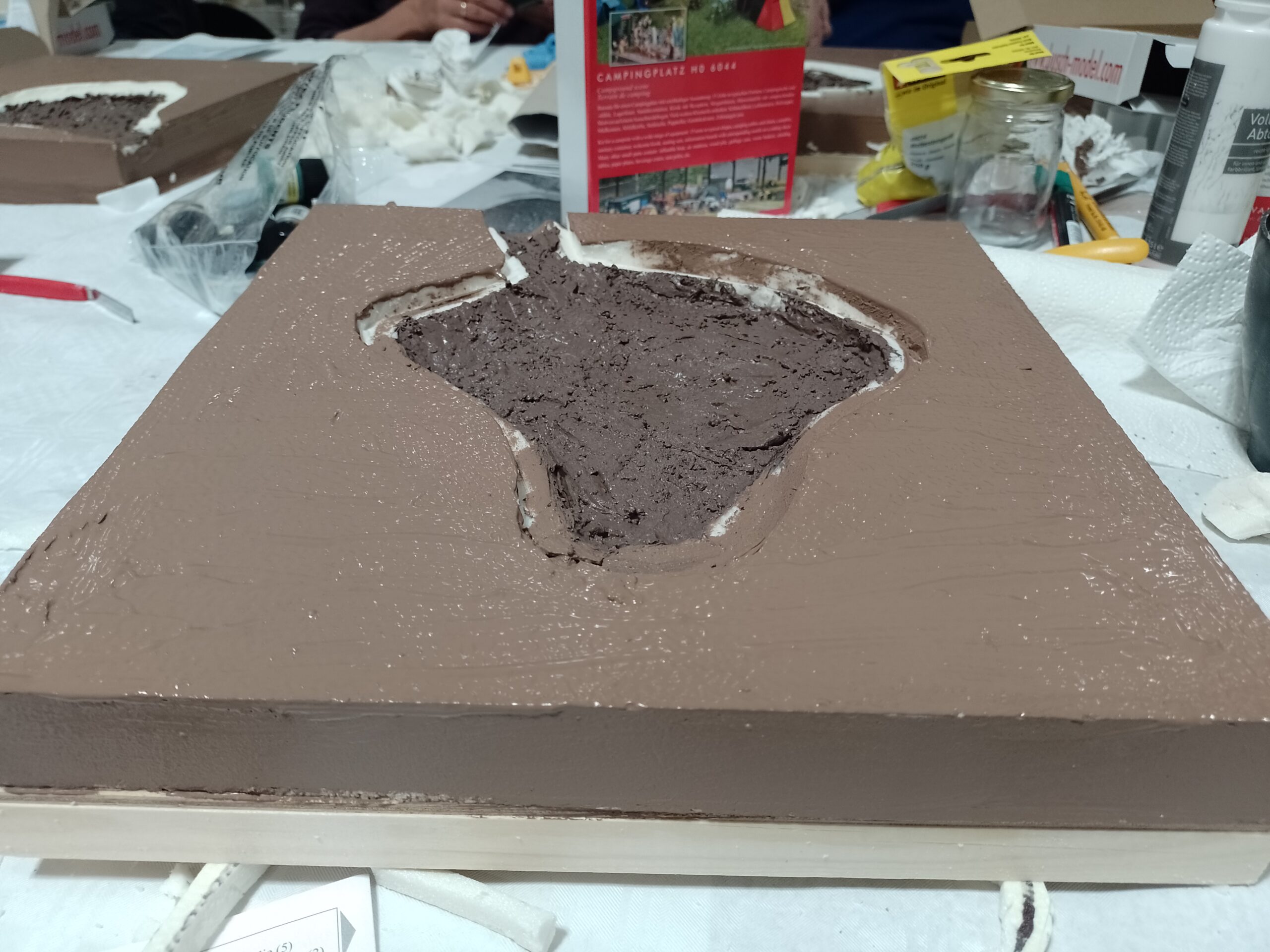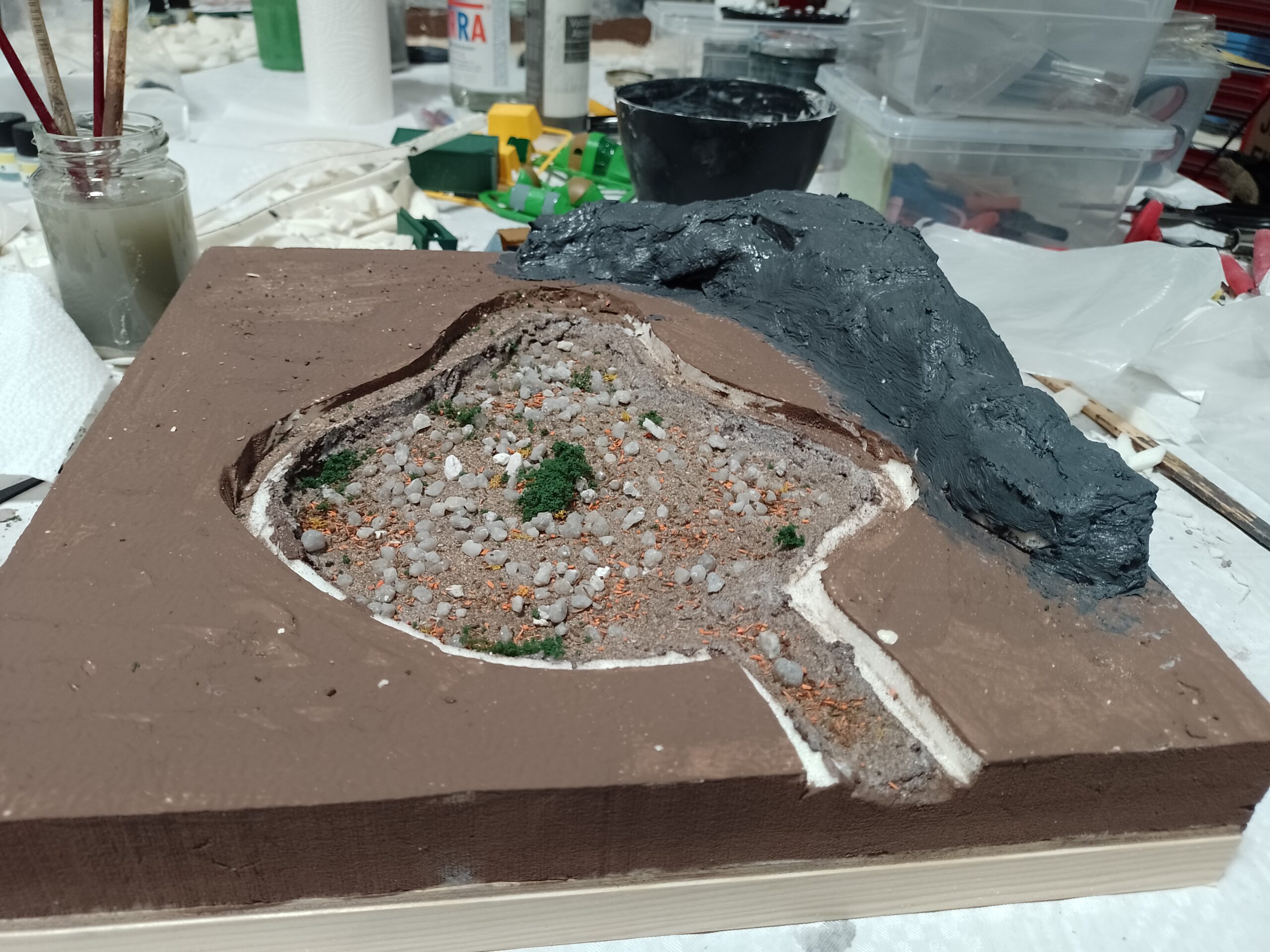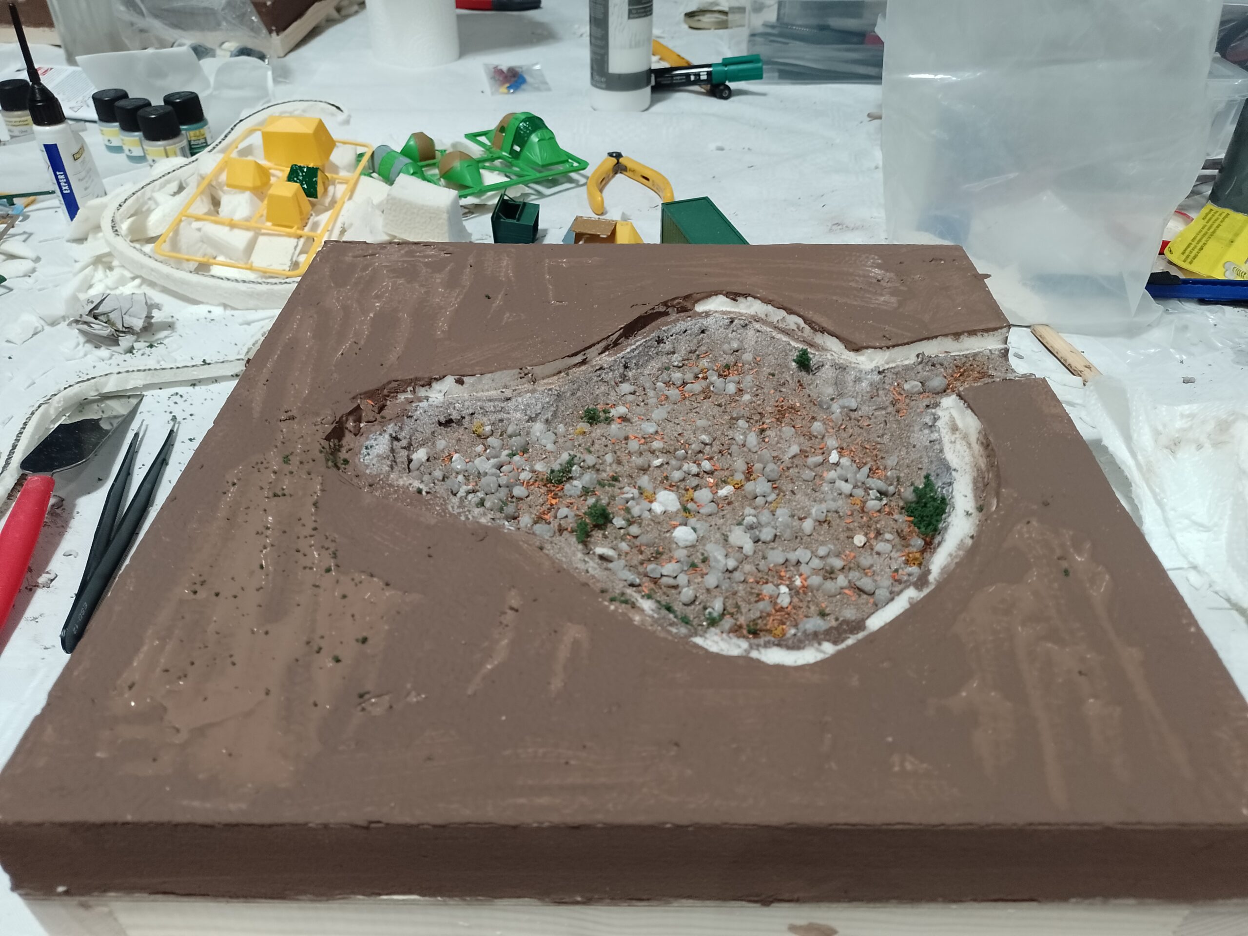 Die Styrodurreste werden mit Holzleim zusammengeklebt und mit Geländespachtel geformt und anschließend gestrichen.