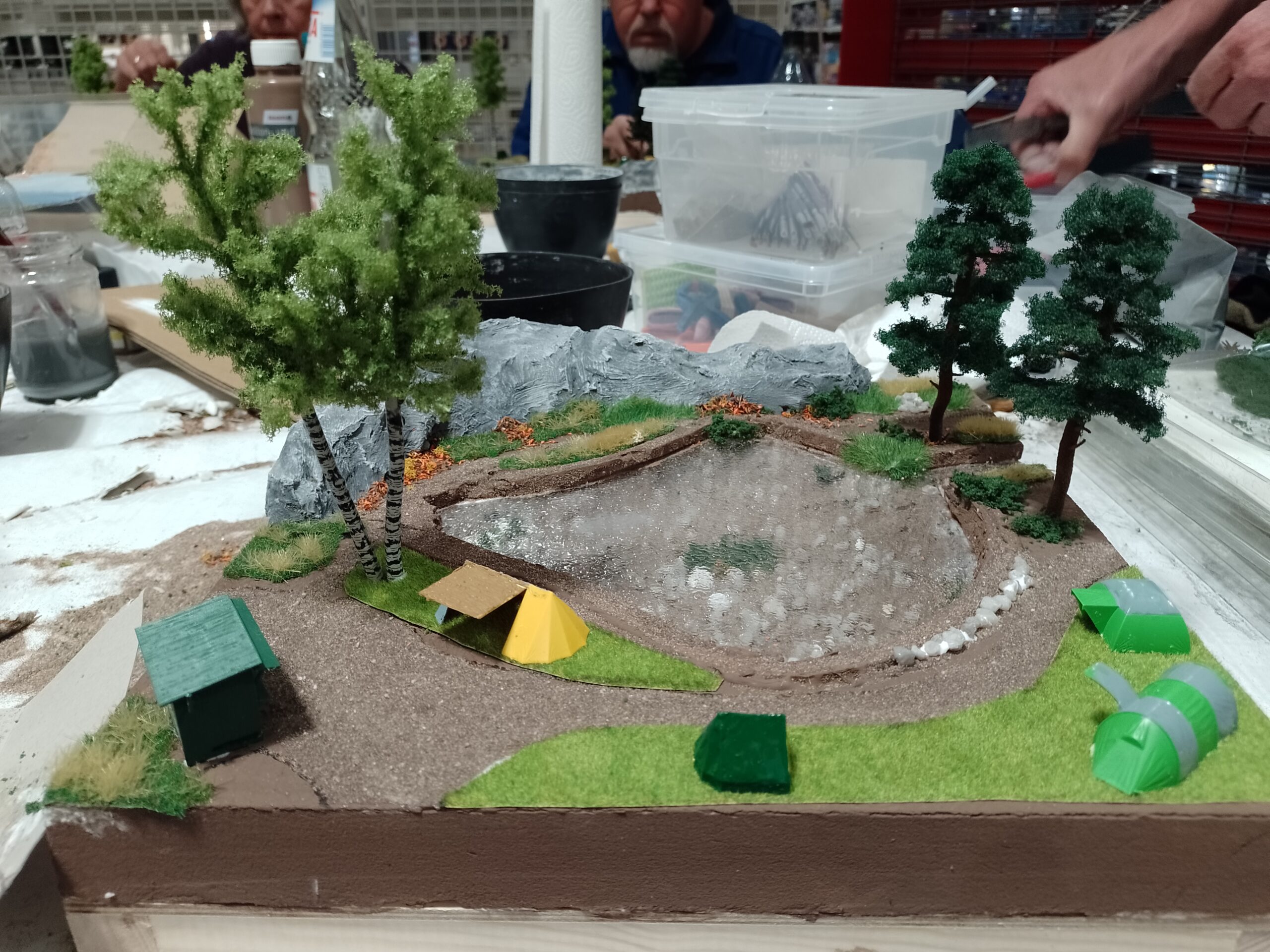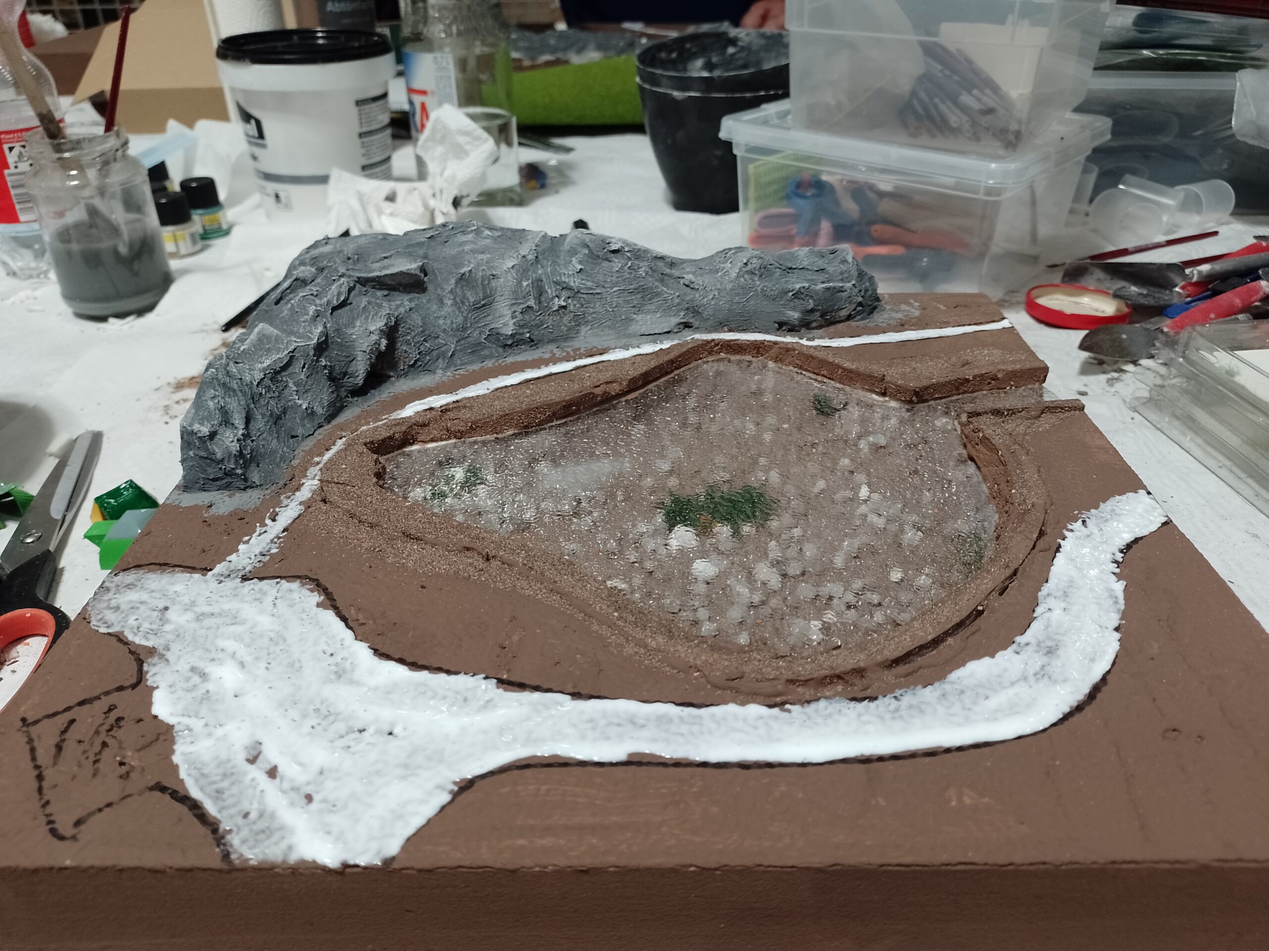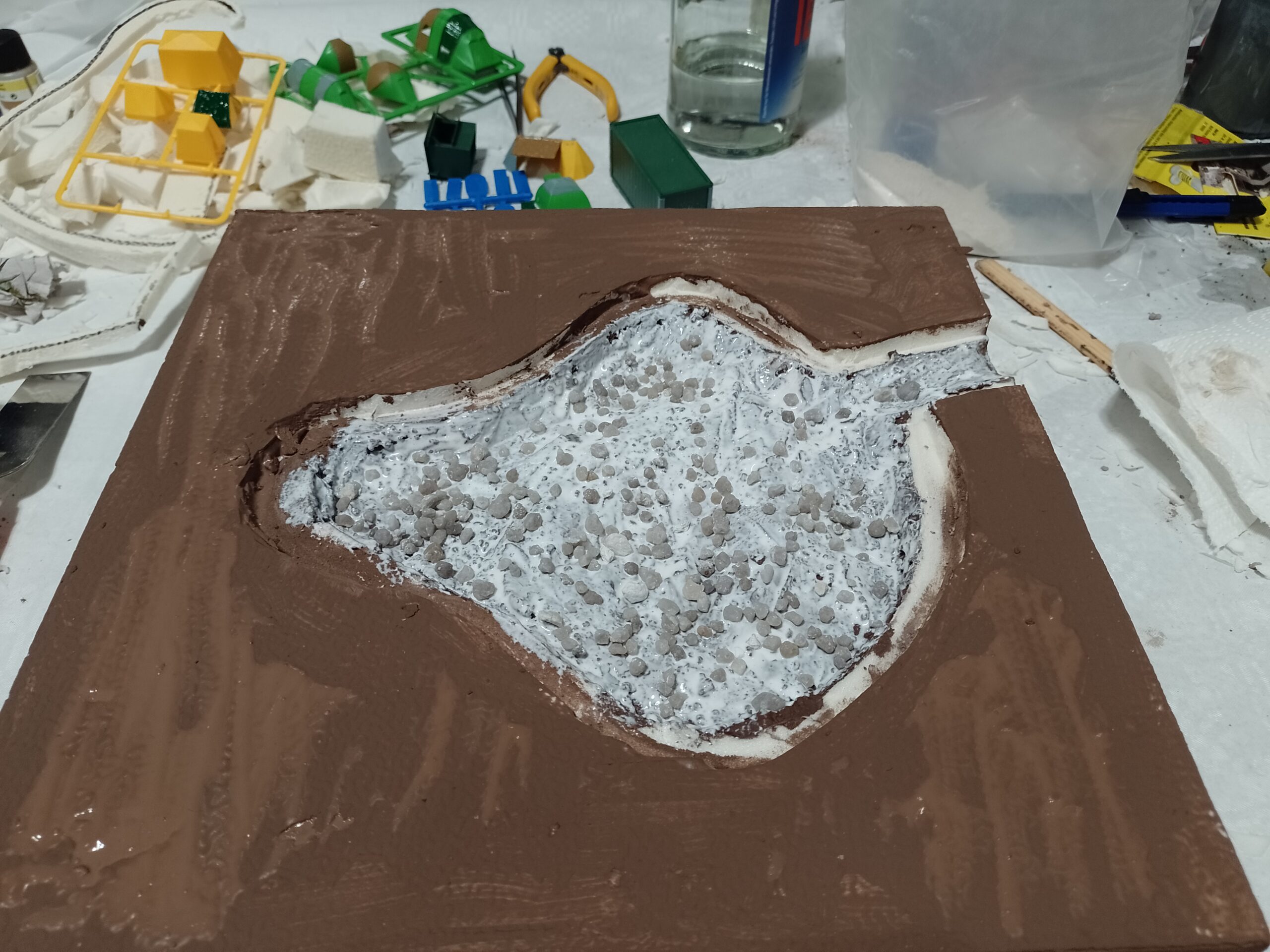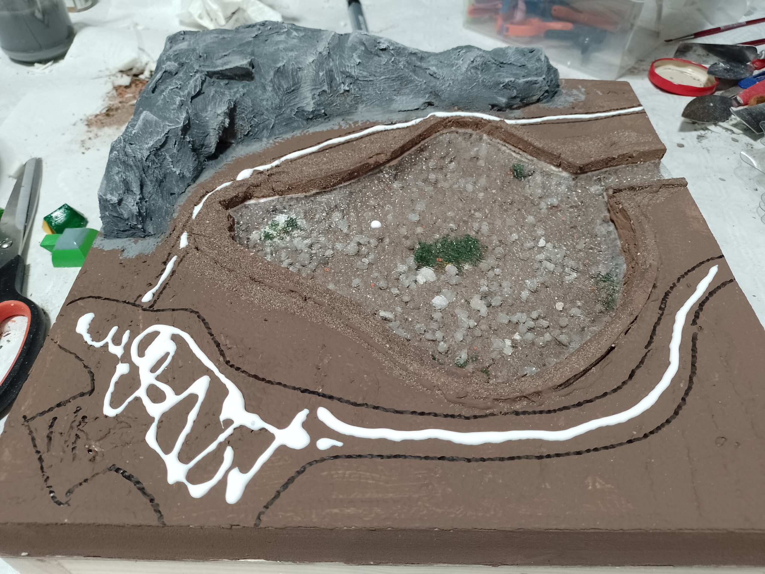 Der Weg rings um das Gewässer wird eingezeichnet und mit Holzleim eingestrichen.